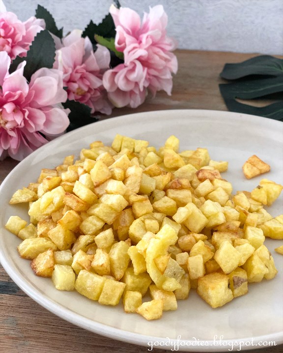 1. In a heavy based saucepan, heat the cooking oil and sesame oil over medium high heat. Add the potatoes and saute for 8-10 minutes, until lightly golden all over. Remove and set aside.